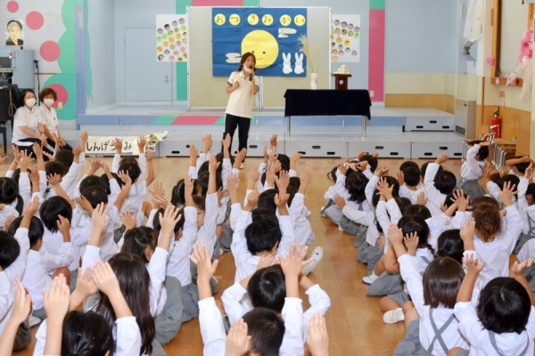 3学年全ての園児が遊戯室に集い、お月見の由来について話を聞きました。