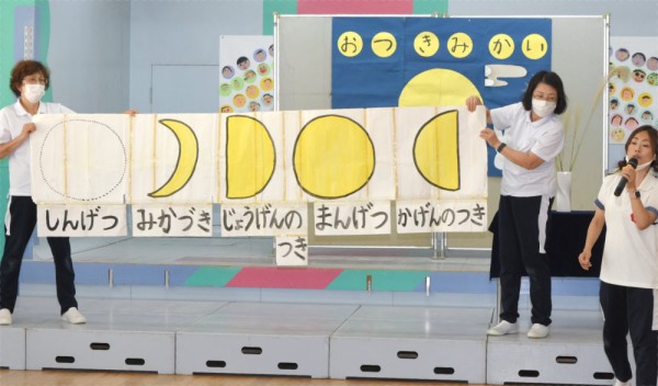 その後、楽しいお月見クイズに挑戦し、大きな図を見ながら月の満ち欠けについても学びました。