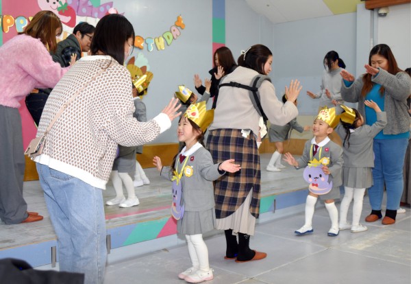 「ハッピーバースデー」の歌で お祝いをしてもらい、自己紹介や各学年ごとに歌を披露したり、ダンス「ラーメン体操」や ふれあい遊び「ごきげんよう」を お家の方と一緒に楽しく過ごしました。