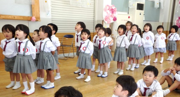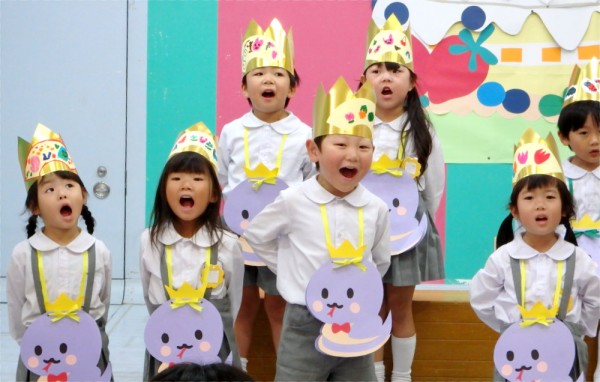 「だんご3兄弟」を歌うグリーンクラスの誕生児(写真上)と声を揃えて歌うクラスの仲間