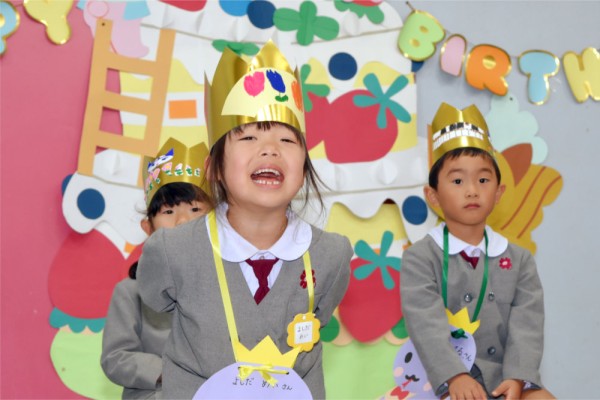 Yクラスの誕生児(写真上)はクラスのお友だちと一緒に「えがおできょうも」を大きな声で歌いました