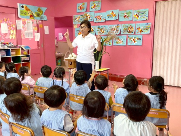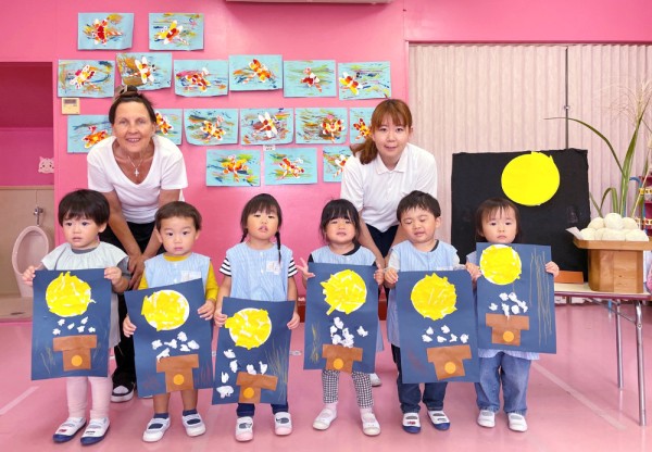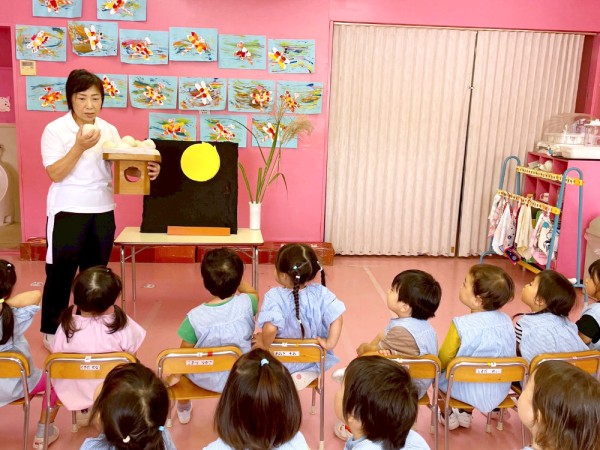 お月さまが1番明るくきれいに見える時が、「お月見」だよ!と、先生がお話すると目をキラキラさせて聞いていました