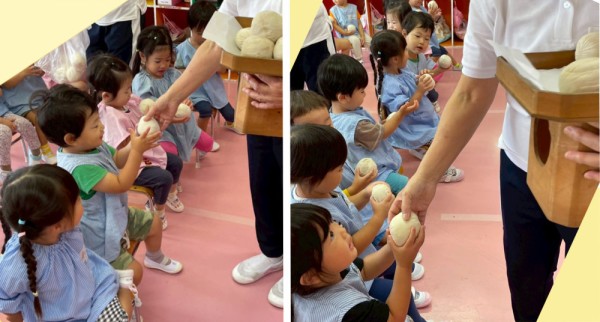 最後は、飾っていたお団子を一人ひとりもらいました。食べるまねっこをして楽しんだ後に、みんなで作ったお月見の製作を手に持って記念写真を撮りました。楽しかったネ。