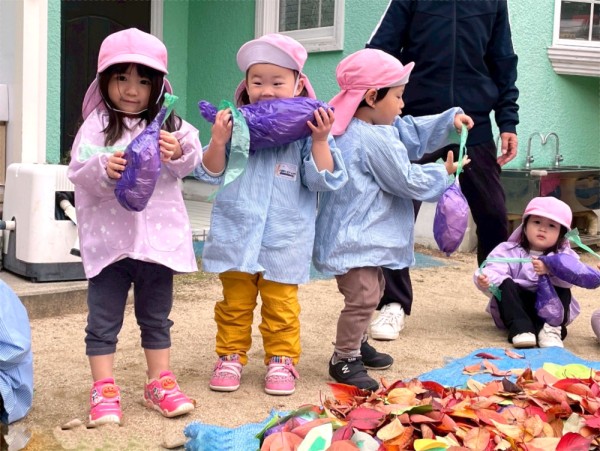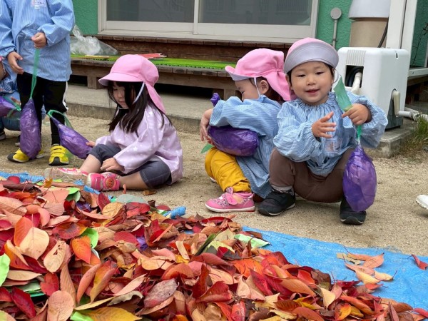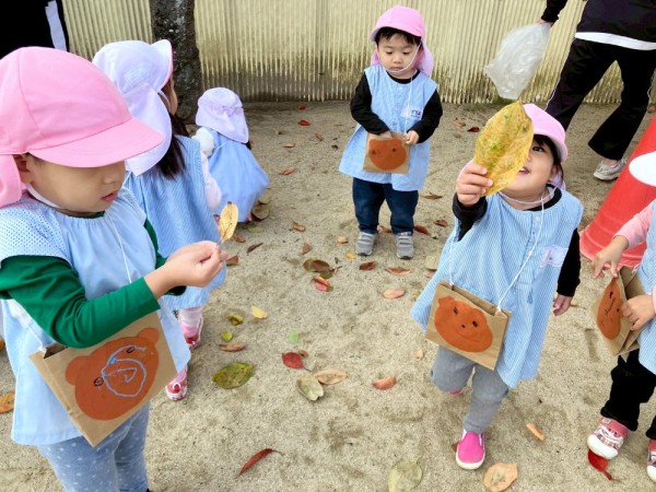 「大きい葉っぱもあるよ!」園庭で落ち葉拾い