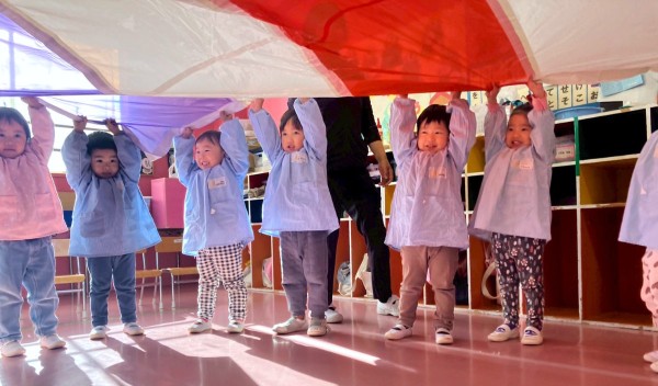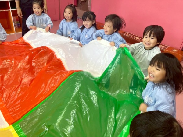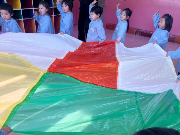 手作りのパラバルーンを使って運動会でグリーンクラスが演じたバルン演技をみんなで再現、子どもたちは嬉々とした表情で楽しんでいました