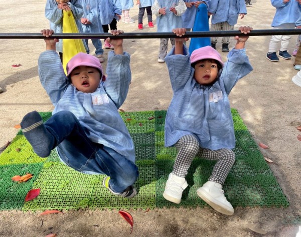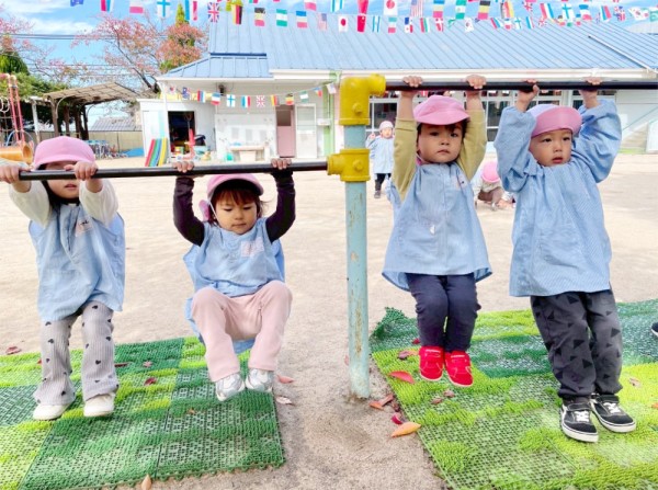 子どもたちが落ち葉拾いで集めた木の葉で昔ながらの焼き芋の疑似体験やコスモスポーツの鉄棒遊びなど屋外だけでなく、室内でも英語遊び、パラバルーン遊び、製作などたくさんの遊びの中から学び成長しています。