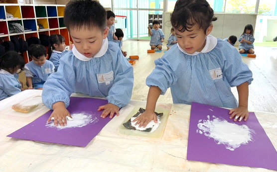 「お月見製作」では、スタンプの感触に興味津々で、月の丸い形をリズム良く押していました