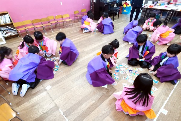 読み札の声をよく聞き、絵札(取り札)を一生懸命探す姿が見られました。最初は戸惑う様子もありましたが、回数を重ねるうちにルールを理解し、「あった ! 」「これかな ? 」と、友だちと声を掛け合いながら楽しんでいました。